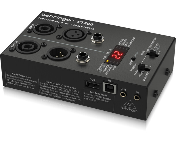 Behringer CT200 — микропроцессорный тестер кабелей 8-в-1, который проверяет любые стандартные кабели для студии и сцены: XLR, Speakon, TRS (¼″, 1⁄8″), TS, RCA, RJ45, MIDI и USB. Тестер поддерживает три режима работы: обычная проверка кабеля, проверка установленного кабеля и генератор тестового тона.