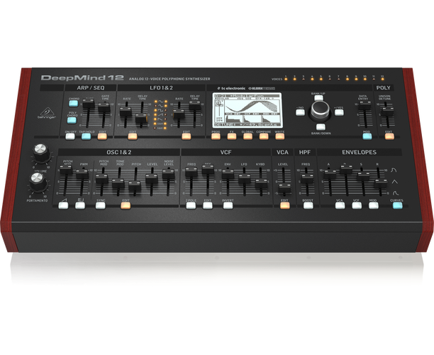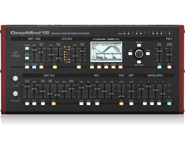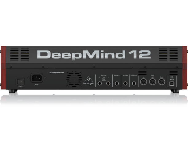 Behringer DeepMind 12D — это 12-голосный аналоговый полифонический синтезатор, который можно использовать как настольный модуль или встроить в рэковую стойку. Он основан на архитектуре клавишного DeepMind 12 и предлагает те же возможности, только без клавиш. Каждый голос оснащён двумя генераторами DCO, двумя LFO с семью формами волны, тремя ADSR-огибающими, шумогенератором и аналоговым фильтром с переключаемым уклоном 12/24 дБ. Дополнительно есть глобальный ВЧ-фильтр с усилением баса.