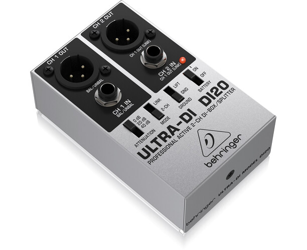 Behringer ULTRA-DI DI20 — активный двухканальный профессиональный директ-бокс / сплиттер, предназначенный для прямого подключения инструментов к микшерным пультам и усилителям, обеспечивая согласование импеданса и уровня сигнала. Директ-бокс преобразует два независимых несимметричных ¼″ TRS-входа в два сбалансированных XLR-выхода.