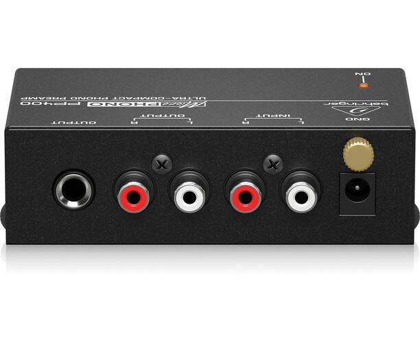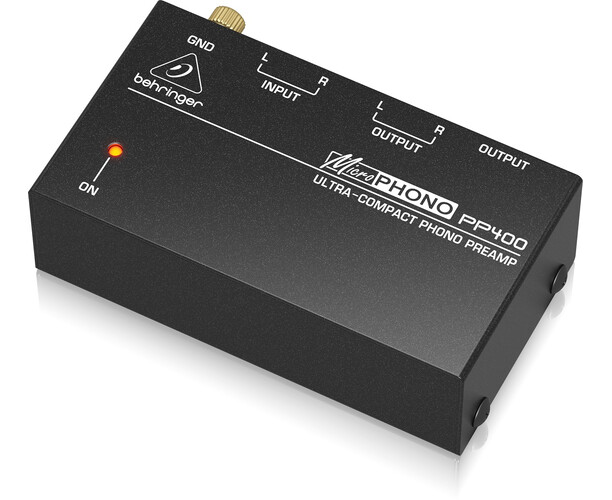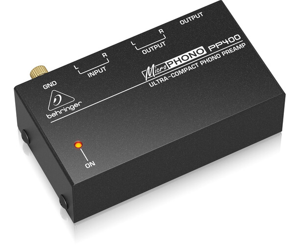 Behringer PP400 — ультракомпактный стерео фонопредусилитель для проигрывателей винила, который преобразует слабый сигнал с проигрывателя в линейный уровень. Оснащён RCA-входами и выходами, а также ¼″ TRS-выходом, что позволяет подключать PP400 к микшерам или домашним аудиосистемам.
