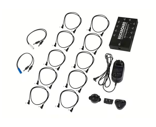 В комплект входят 10 плоских силовых кабелей RockBoard (60 см), а также Y-кабели для удвоения напряжения (синий) и тока (белый), обеспечивающие гибкость для педалей