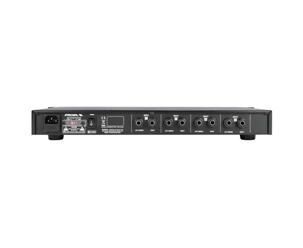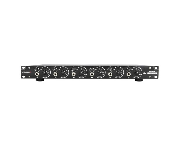 PROEL HPAMP106 — шестиканальный усилитель для наушников из серии 100, предназначенный для мониторинга на сцене, в студии и в стационарных инсталляциях. Поддерживает 4 переключаемых входа (стерео/моно) через разъёмы ¼" Jack (47 кОм, макс. уровень +25 dBu). На фронтальной панели расположены 6 стереовыходов (¼" Jack) с индивидуальными регуляторами громкости и переключателями входных сигналов — каждый слушатель может выбрать один из четырёх источников.