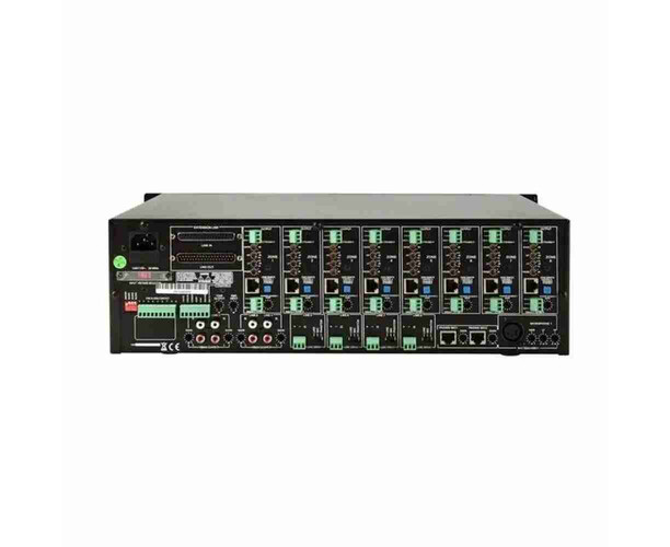 и 2 порта RJ45 для пейджинговых консолей, использующих кабель CAT5. Встроенный дисплей отображает выбранный входной канал для каждой зоны, а внутренний