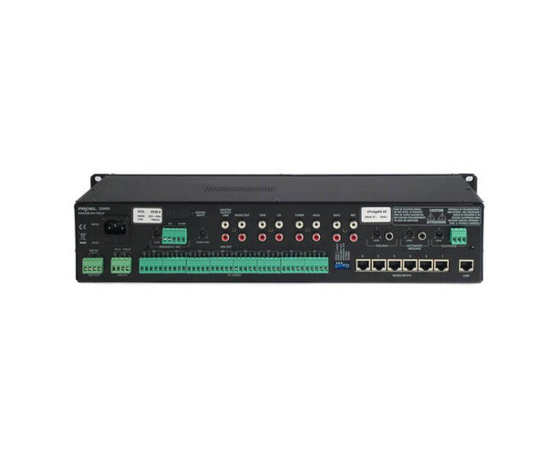 Активные объявления отображаются светодиодными индикаторами “BUSY”, двухтональная сирена DIN33404 и выход для записи всех событий расширяют функциональность. Питание от сети 230 В (50 Гц) с резервным источником 24 В постоянного тока. Компактный 19-дюймовый рэковый корпус (2U, 483x88x168 мм) весом 4,9 кг облегчает монтаж. PROEL PA ZONE8 — универсальное решение для профессионального аудиоуправления
