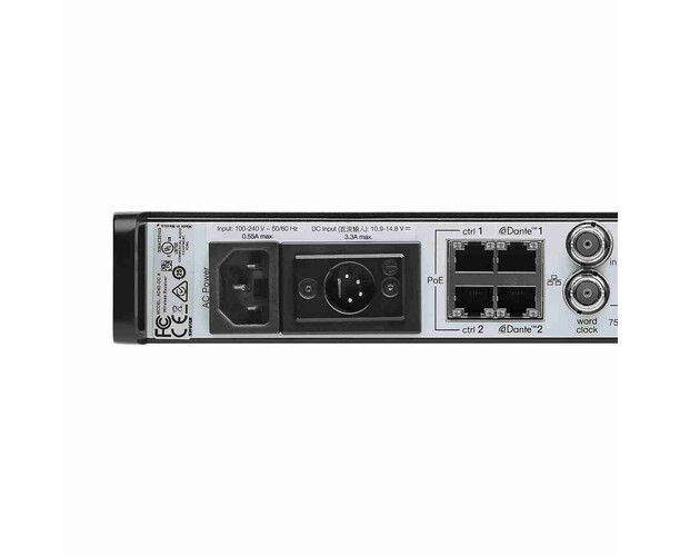 Приемник поддерживает цифровые выходы Dante, AES67 и AES3, а также аналоговые XLR и 6,35 мм с переключаемыми уровнями (Line/Mic). Низкая задержка и высокая спектральная